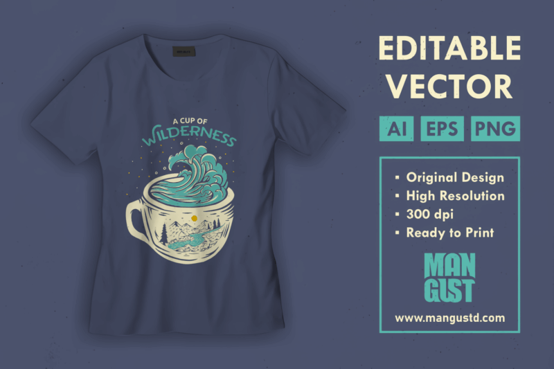 A Cup of Wilderness is a vintage illustration that is suitable for apparel or merchandise about nature, outdoors, summer, vacation, holiday, adventure, coffee, caffeine, drink, food, barista, cappuccino, espresso, latte.