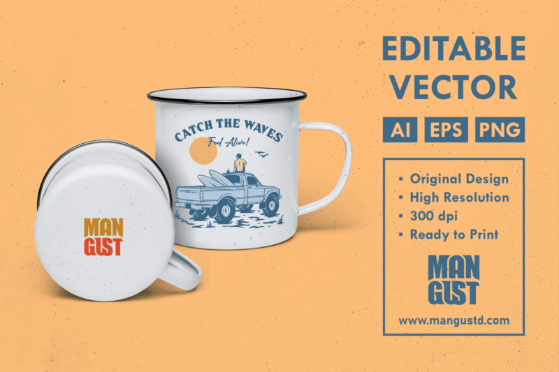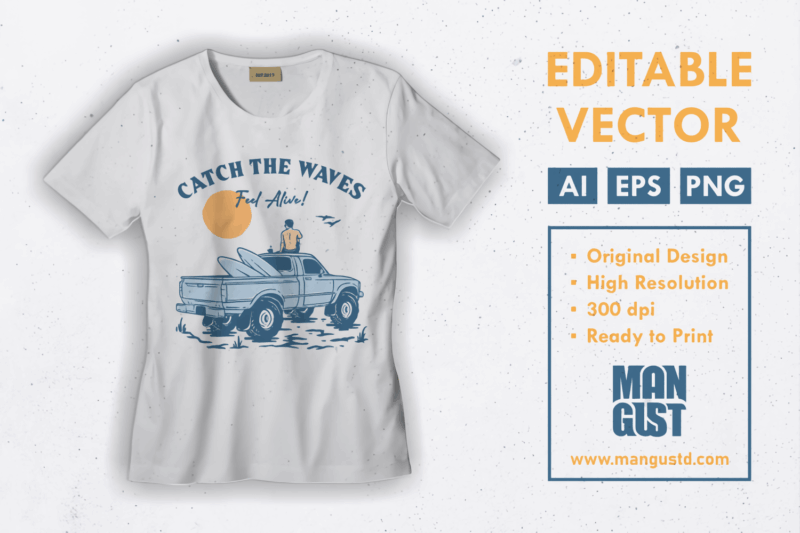 Catch the Waves is a vintage handdrawn illustration that is suitable for apparel or merchandise about surfing, surfboard, summer, vacation, holiday, travel, beach, sea, ocean, island, tropical, sport, hawaii, paradise, california.