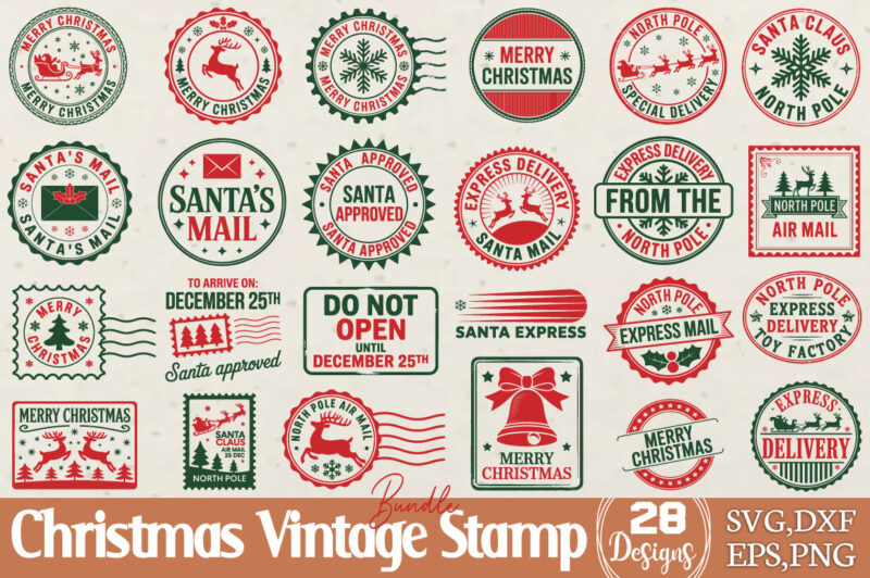 Design Title: "Christmas Vintage Stamp Svg Bundle" which you will receive as a zip file with the following format.