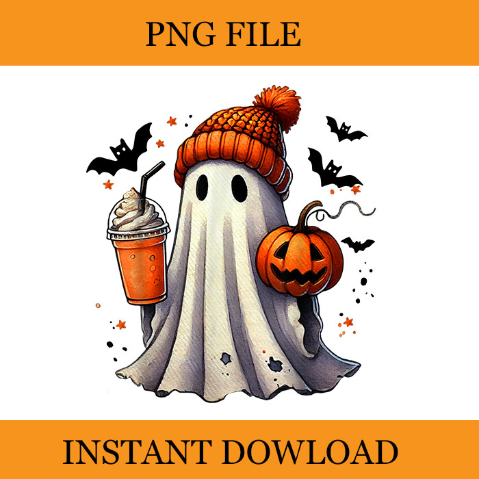 Cute Ghost Drinking Pumpkin Spice Coffee Halloween PNG, Cute Ghost PNG