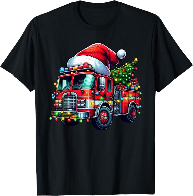 Funny Firetruck Santa Christmas Tree Lights Womens Mens Kids T-Shirt