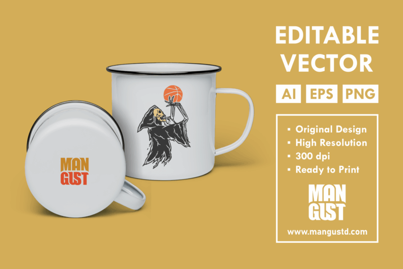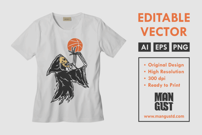 Grim Reaper Basketball is a vintage handdrawn illustration that is suitable for apparel or merchandise about skull, skeleton, horror, halloween, grim reaper, trick or treat, death, ghost, gothic, zombie, sport, basketball, ball, slam dunk, games.