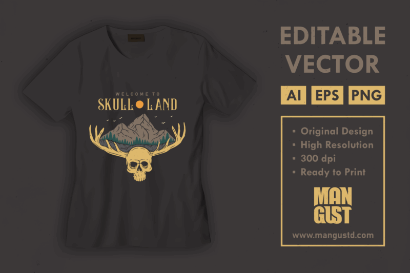 Horror Skull Land is a vintage illustration that is suitable for apparel or merchandise about nature, outdoors, adventure, paradise, mountain, wildlife, skull, horror, halloween, skeleton.
