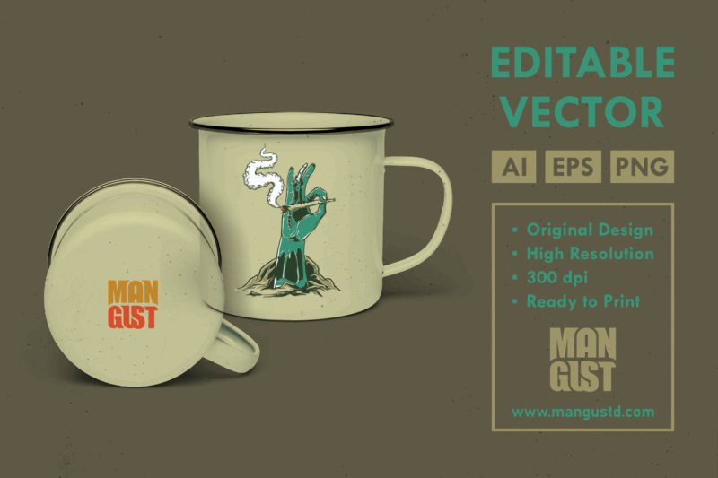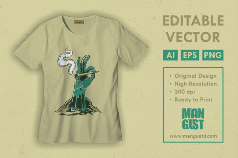 Marijuana in Zombie's Hand is a vintage illustration that is suitable for apparel or merchandise about monster, zombie, halloween, horror, skull, skeleton, scary, smoke, weed, bud, marijuana, cannabis, cigarette.