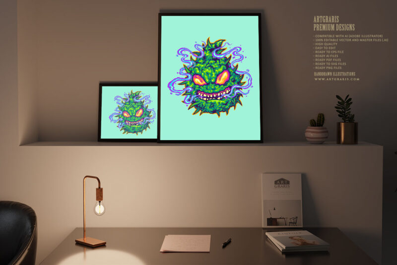 Marijuana leaf plant monster with weed smoke illustrations t shirt designs for sale