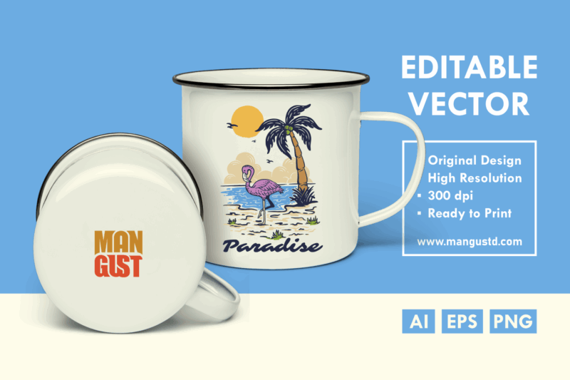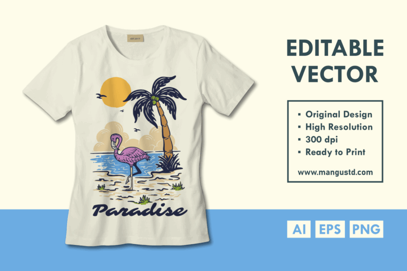 Paradise Beach is a vintage handdrawn illustration that is suitable for apparel or merchandise about nature, outdoors, summer, vacation, holiday, travel, beach, sea, ocean, flamingo, tropical, island, surfing, paradise, hawaii.