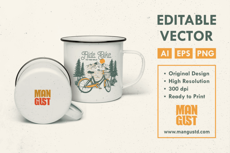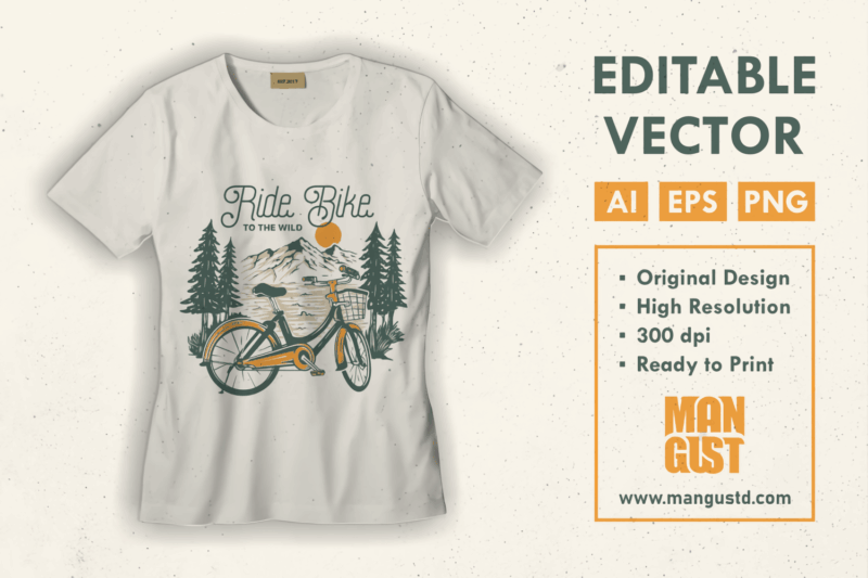 Ride Bike to the Wild is a vintage handdrawn illustration that is suitable for apparel or merchandise about bike, bicycle, biker, cycle, nature, outdoors, mountain, adventure, trip, travel, national park, wanderlust, mountain bike, summer.