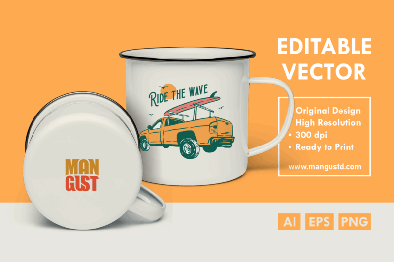 Ride the Wave is an illustration that is suitable for t-shirts, apparel, or merchandise about summer, vacation, holiday, travel, beach, sea, truck, surf, surfboard, surfing, tropical, sport, surfer, nature, wave.