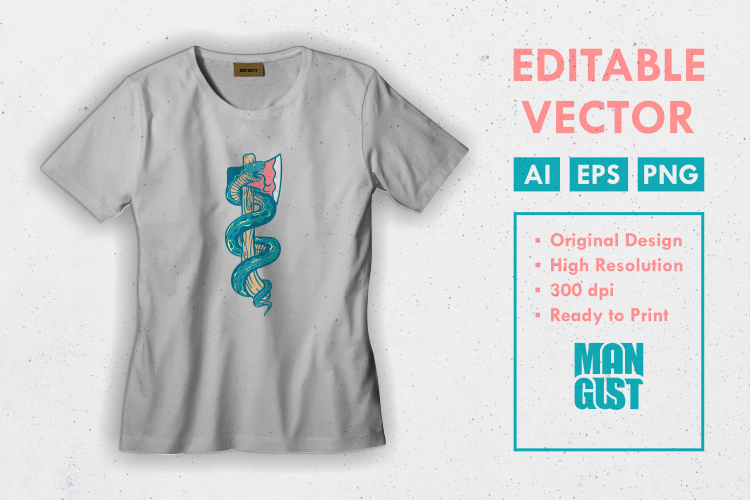 Snake on The Ax is a vintage illustration that is suitable for t-shirts, jackets, or merchandise with the theme of sword, warrior, armor, ax, ancient, axe, knight, dark, scandinavian, snake, animal, wildlife, reptile, viper, nature.