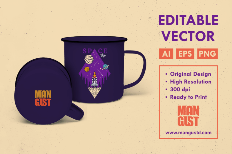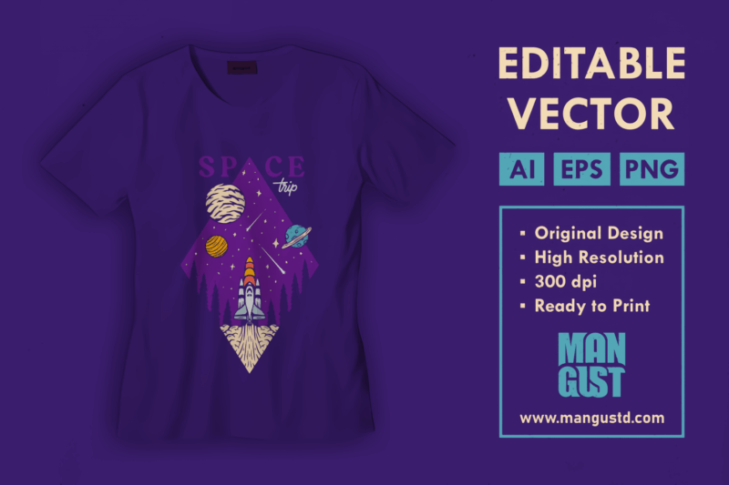 Space Trip is a vintage handdrawn illustration that is suitable for apparel or merchandise about space, ufo, alien, nasa, planet, astronaut, rocket, galaxy, outer space, universe, fantasy, trip, travel, adventure, fantasy.