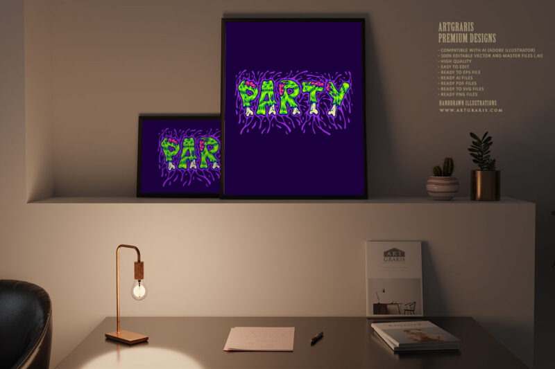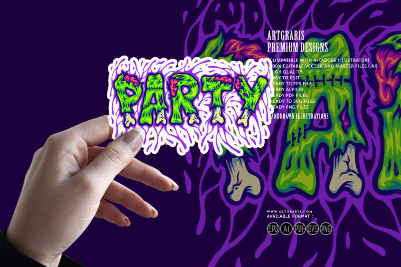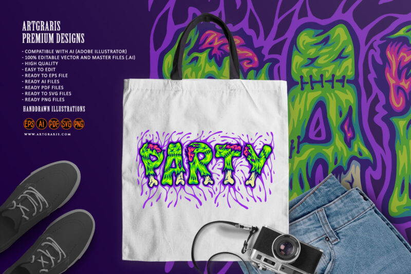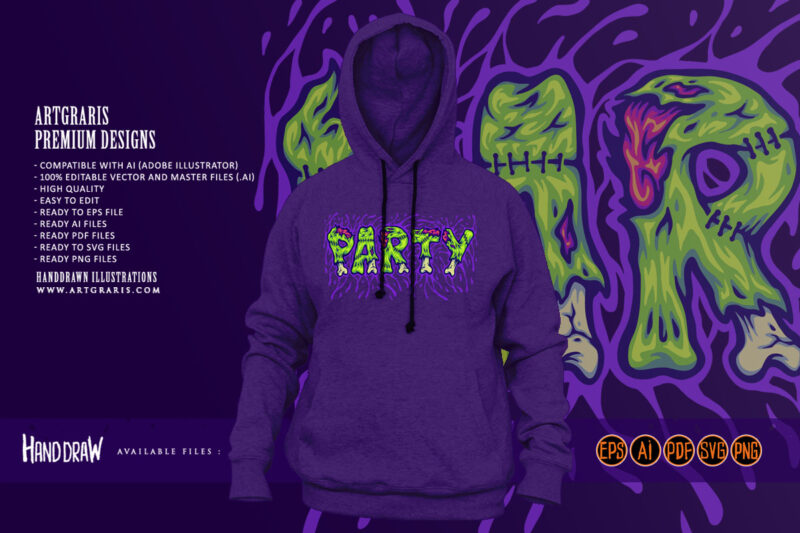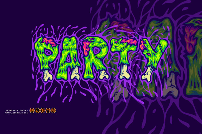 Vector illustration Spooky zombie bone word party text lettering word suitable for various purposes, such as Illustration on Merchandise T-shirts, Tote Bags, stickers, banners or Decorations, greeting, Postcards, flyers, posters, and other design products.