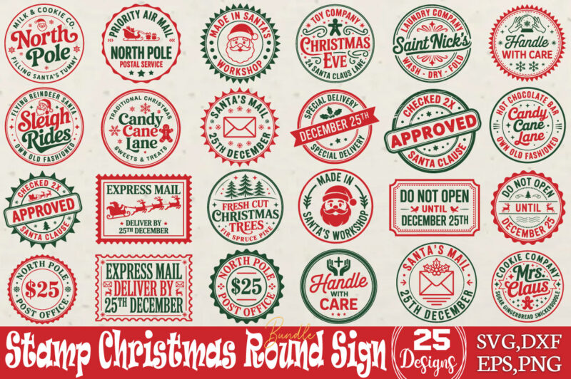 Design Title: "Stamp Christmas Round Sign SVG Bundle" which you will receive as a zip file with the following format.