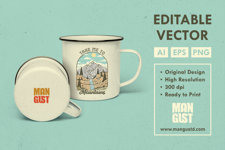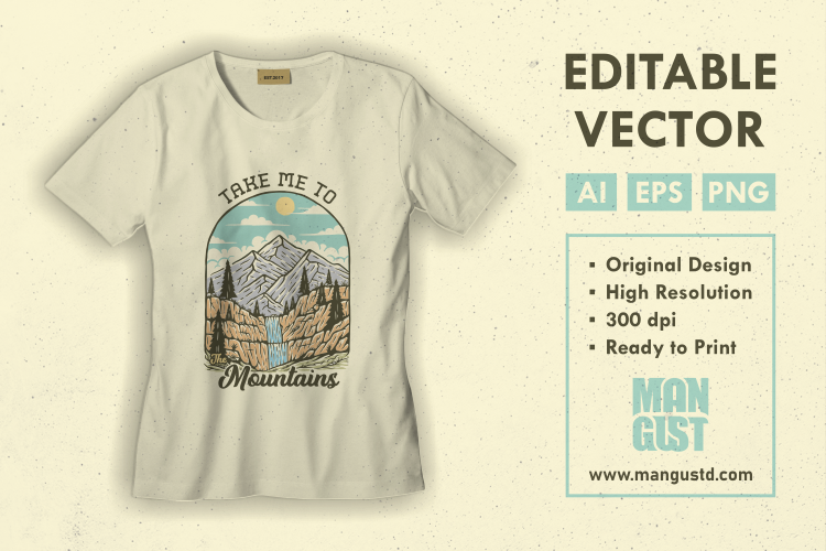 Take Me to the Mountains is a vintage handdrawn illustration that is suitable for apparel or merchandise about nature, outdoors, travel, adventure, waterfall, mountain, camping, national park, holiday, hiking, backpacker, wildlife, wanderlust, wild, forest.