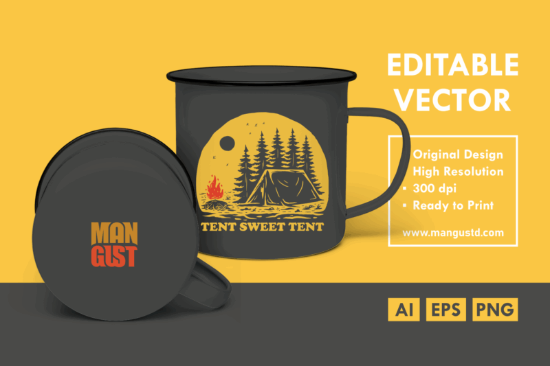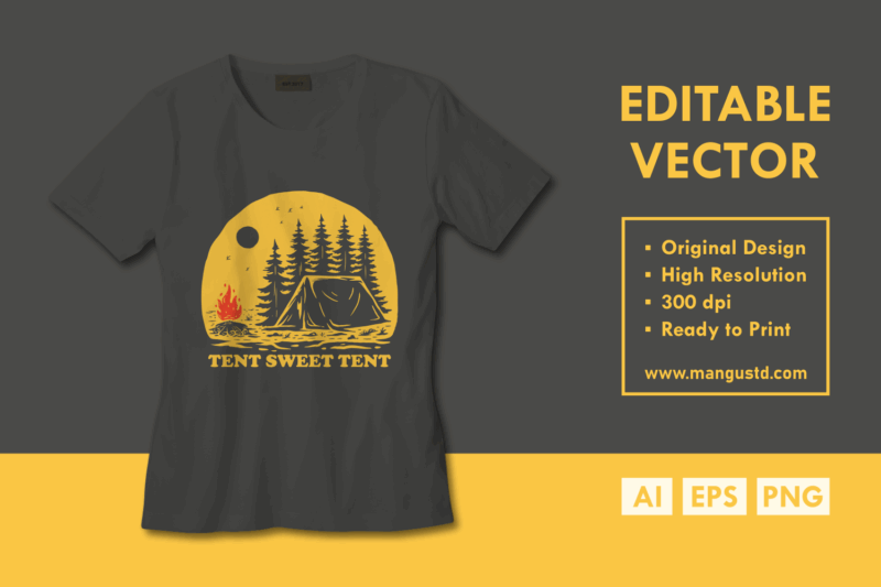Tent Sweet Tent is a vintage handdrawn illustration that is suitable for apparel or merchandise about nature, outdoors, adventure, camping, camper, campfire, tent, national park, wildlife, vacation, holiday, mountain, backpacker, forest, summer.