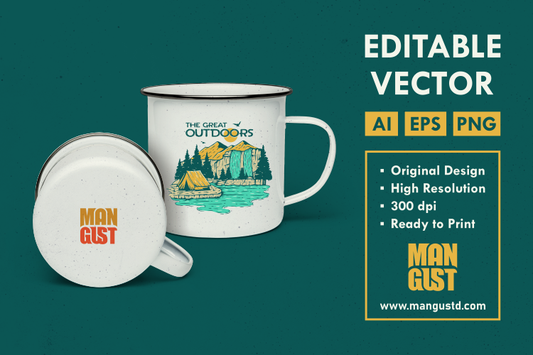 The Great Outdoors is a vintage handdrawn illustration that is suitable for apparel or merchandise about nature, outdoors, adventure, camping, camper, campfire, tent, national park, wildlife, vacation, holiday, mountain, backpacker, waterfall, summer.