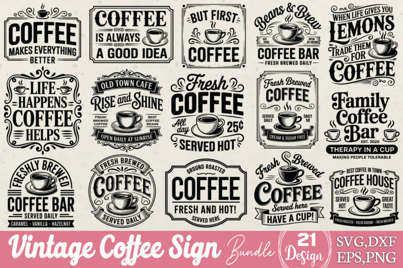 Design Title: "Vintage Coffee Sign SVG Bundle" which you will receive as a zip file with the following format.