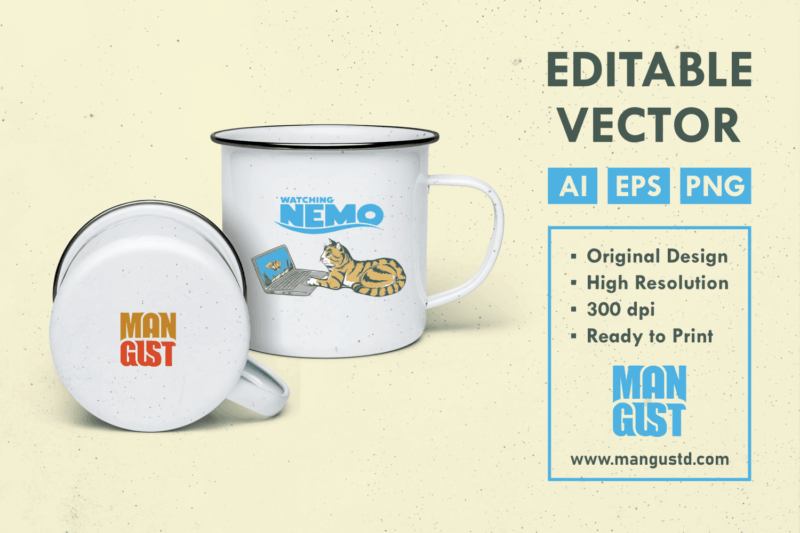 Watching Nemo is a vintage handdrawn illustration that is suitable for apparel or merchandise about nemo, cat, animal, cute, kitten, kitty, funny, fish, movie, meme, pet, cinema, film, ocean, fishing.