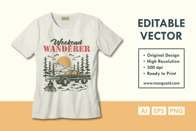[email protected]Weekend Wanderer is a illustration that is suitable for t-shirts, jackets, or merchandise with the theme of nature, outdoors, adventure, travel, holiday, vehicle, mountain, national park, camping, wanderlust, summer, vacation, wild, journey, hiking.