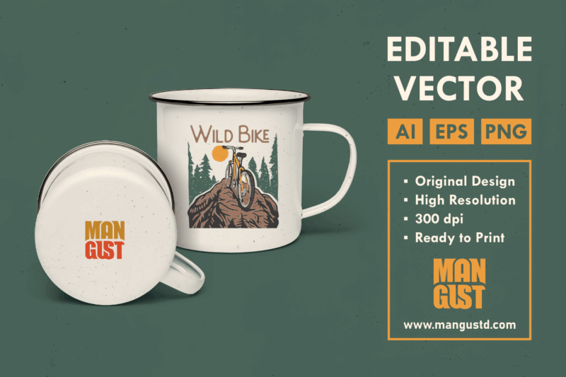 Wild Bike is a vintage handdrawn illustration that is suitable for apparel or merchandise about nature, outdoors, trip, travel, adventure, vacation, holiday, camping, bike, bicycle, biker, national park, hiking, mountain, sport.
