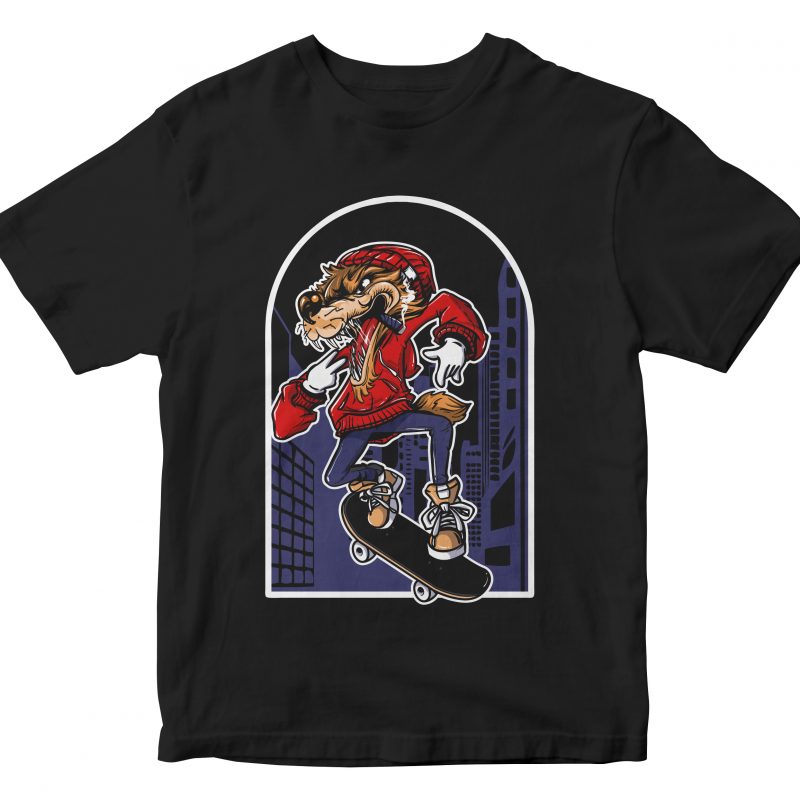 Wolf skateboard cartoon vector t-shirt design for commercial use