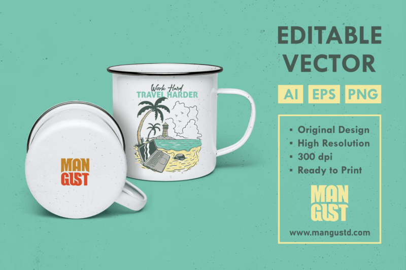 Work Hard Travel Harder is a vintage handdrawn illustration that is suitable for apparel or merchandise about nature, outdoors, trip, travel, adventure, vacation, holiday, camping, beach, sea, ocean, work, hard work, summer, working.